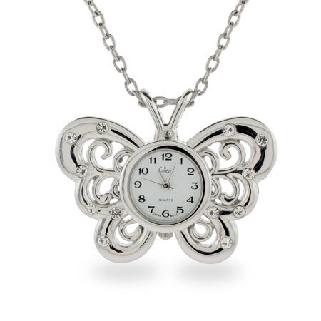 Butterflies have always been a beautiful symbol of change and growth - and now, they can tell time, too! This lovely sparkling cz silver butterfly watch pendant features a 5/8 inch watch face, set between two outstretched, cz accented wings. If you love butterflies, this is a long awaited addition to your wardrobe! Great for adults and children, this beautiful sparkling cz silver butterfly watch necklace comes on a 30 inch chain and matches any outfit - and looks great with any of our other butterfly earrings, rings, and necklaces.